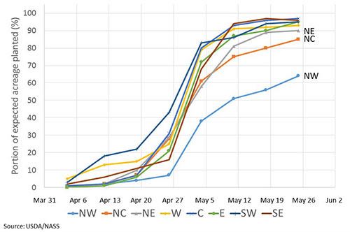 The latest USDA report on planting progress (May 26) shows that about 15 percent of the planned corn acres in Missouri have not been planted. This is almost 500,000 acres. Most of these acres are located in northwest Missouri. The USDA report suggests that only 64 percent of the anticipated corn acres have been planted in the NW Missouri crop reporting district.